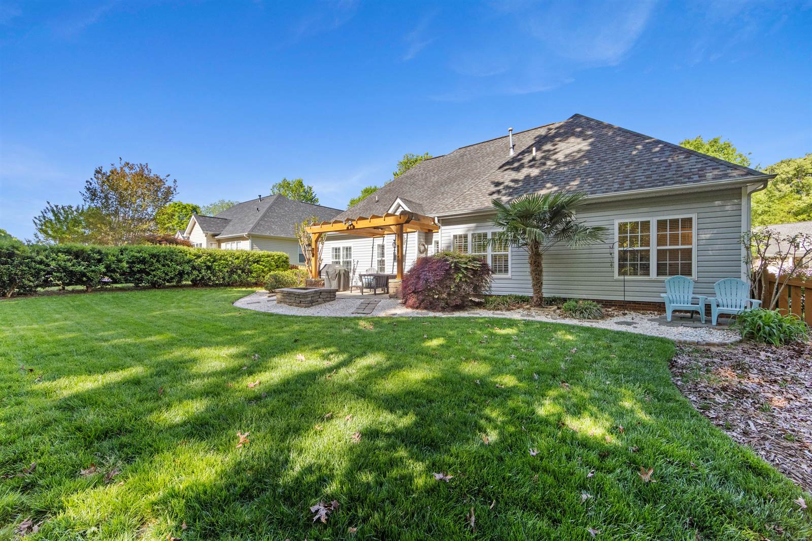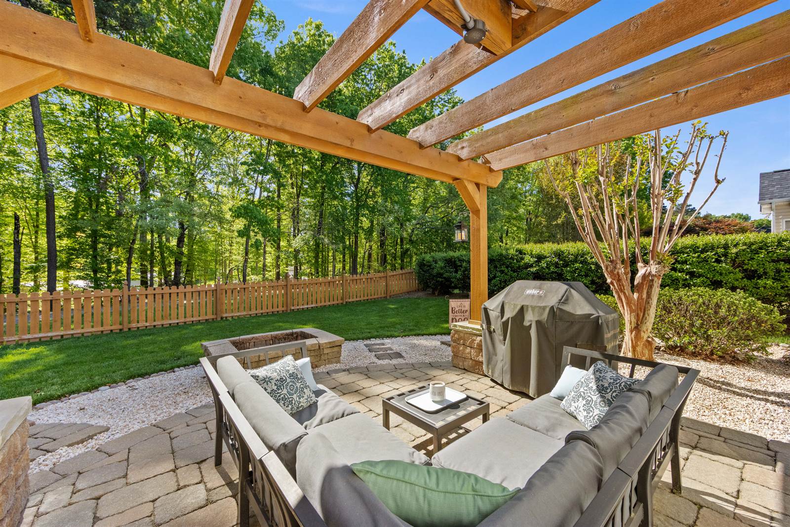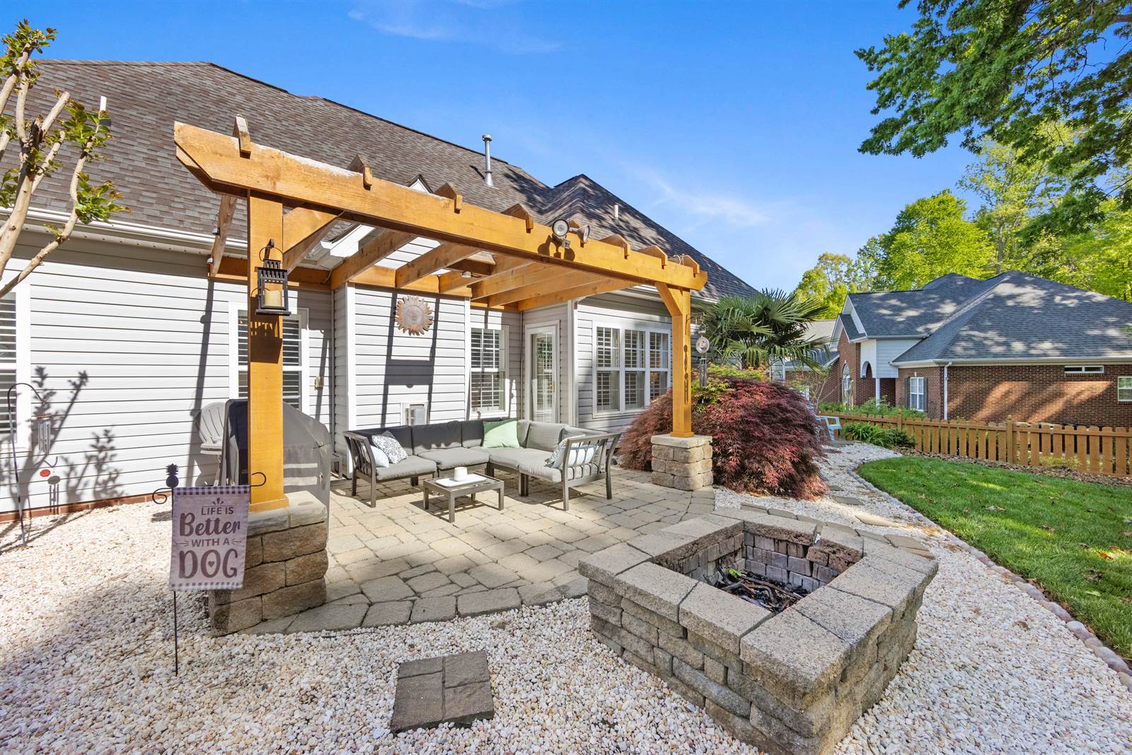 Soaring ceilings in the great room create an airy, open feel, filled with natural sunlight. The fenced back yard is your perfect retreat. Boasting a fire pit, paved patio and a charming pergola, its the kind of outdoor space you'll look forward to coming home