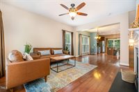 columns sets the tone for the inviting interior. The main level boasts vinyl wood-like flooring, abundant natural light, and a cozy gas fireplace, creating a seamless flow between the living, dining, and kitchen areas—ideal for everyday living and entertaining.
