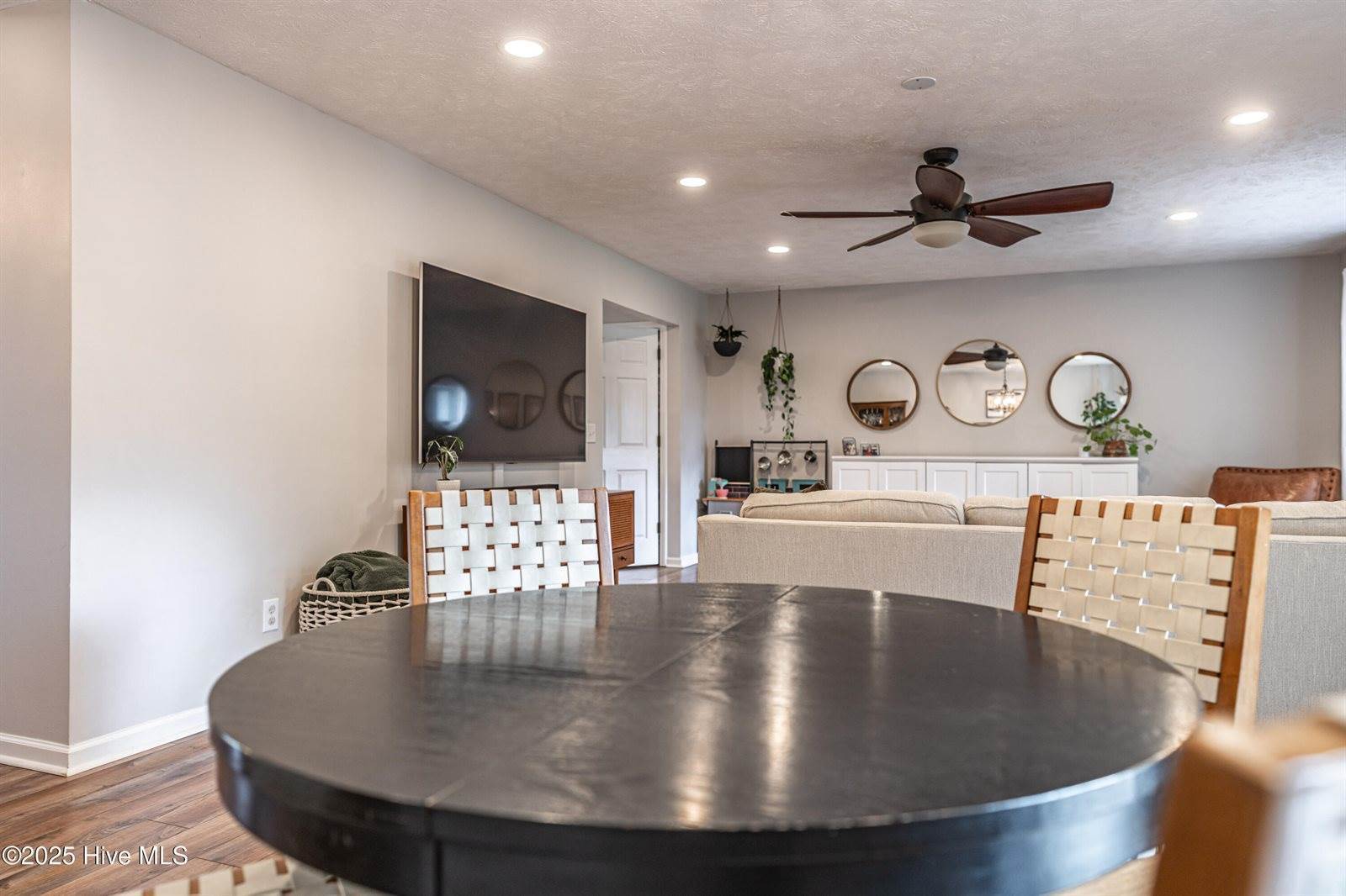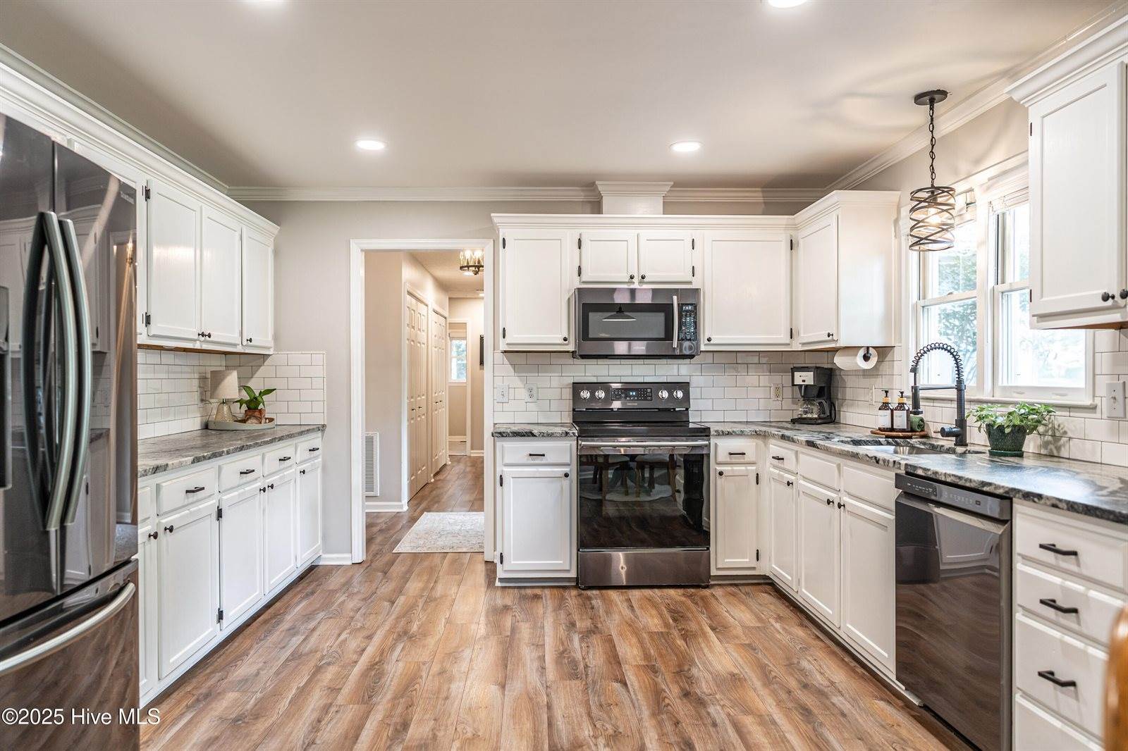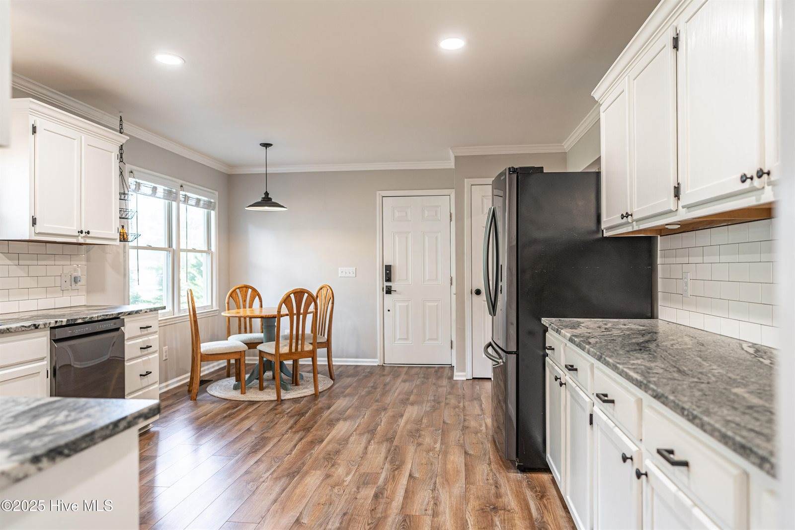 boasts ample counter space, crisp cabinetry, and an eat-in dining area-ideal for everyday meals or entertaining.Both bathrooms have been tastefully renovated with modern finishes, creating fresh and stylish spaces. Luxury vinyl plank (LVP) flooring flows seamlessly