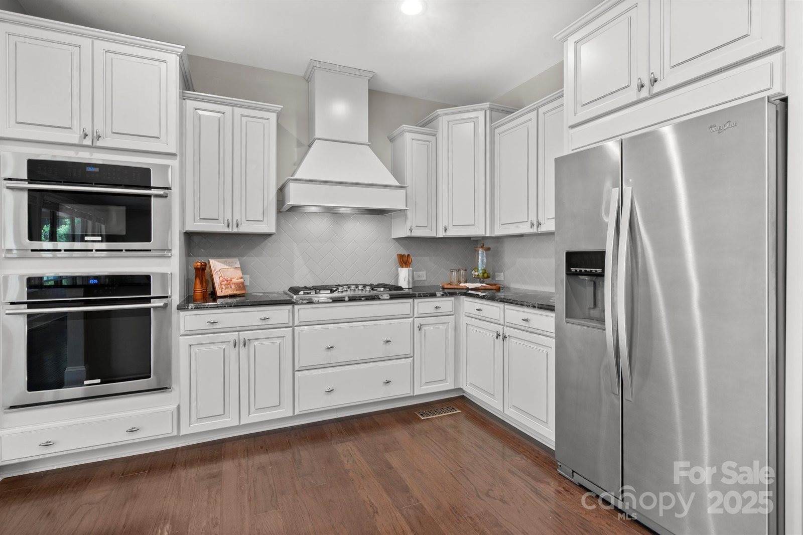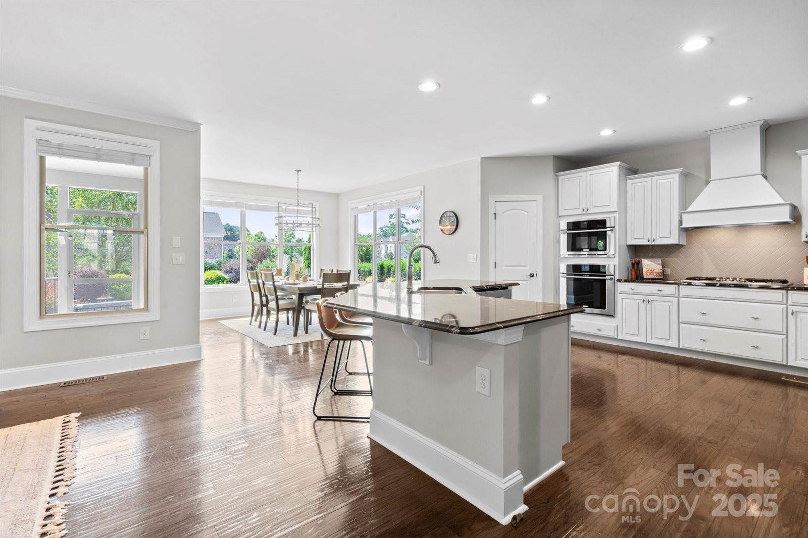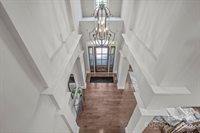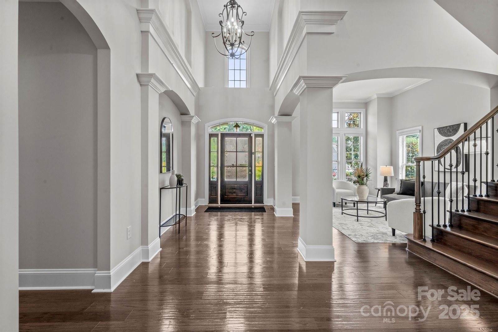 door, inviting 2 story foyer, tall ceilings, elegant architectural details & trim work, neutral paint, hardwood flooring, dual staircases, & cabinets in laundry room & garage. The impressive & open gourmet kitchen is the heart of this home & showcases beautiful
