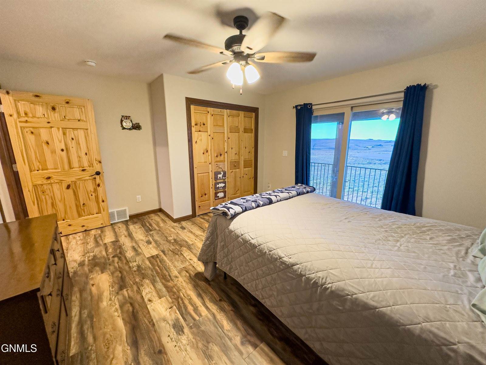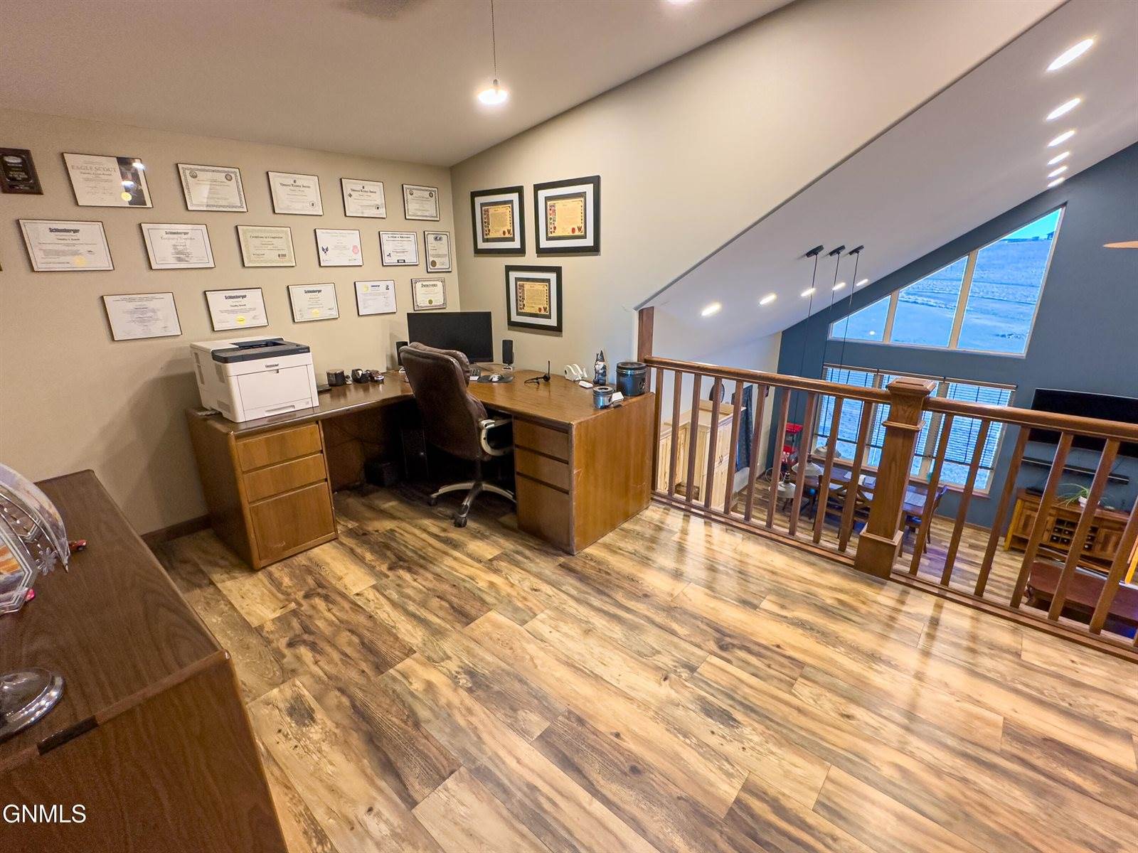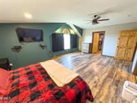 walk-in closet and a serene ensuite bathroom. Adjacent, an office space overlooks the family living area below. Downstairs, two main-floor bedrooms offer their own retreats, each featuring walk-out sliding doors opening onto the expansive wrap-around deck—an