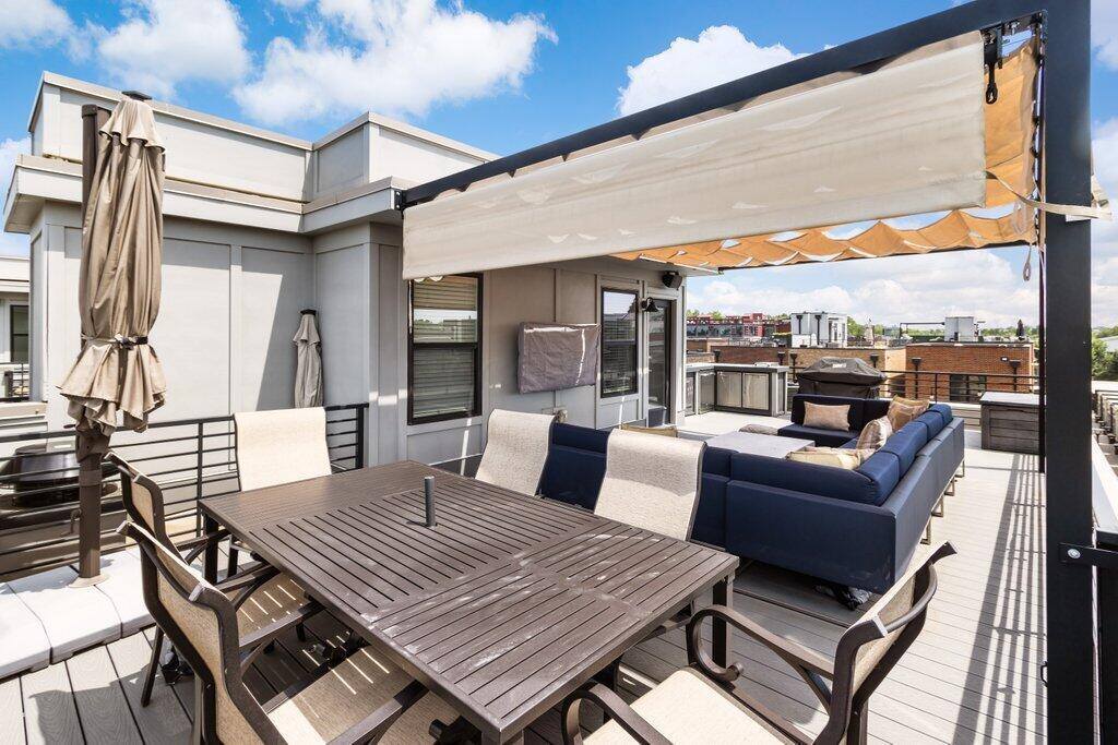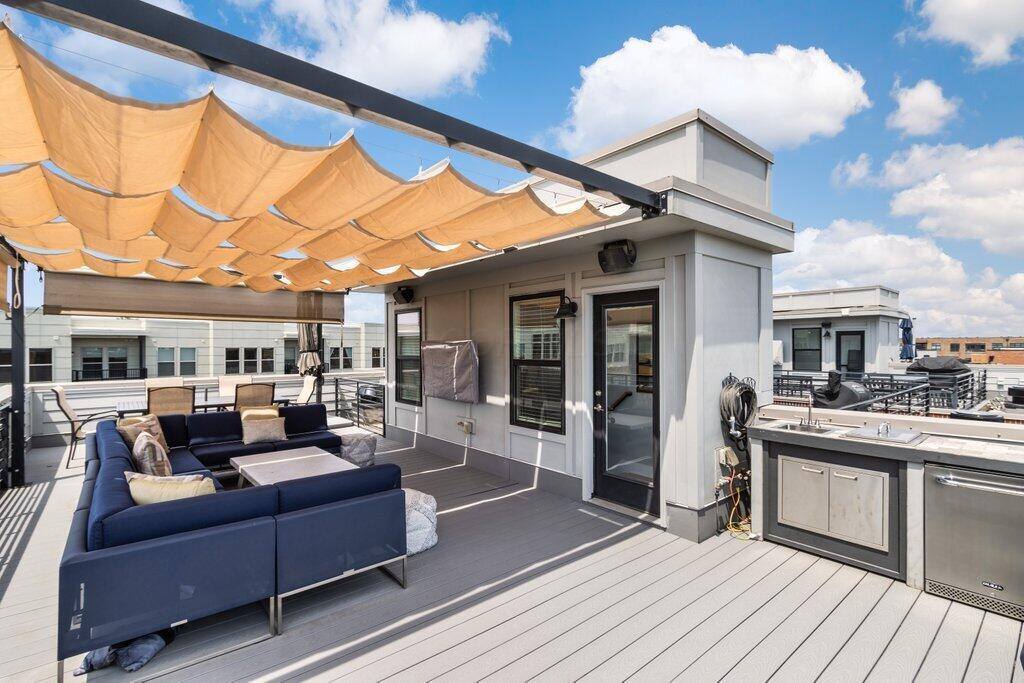 the multiple outdoor living spaces. The oversized rooftop terrace is perfect for both relaxation and entertainment. Complete with a fully equipped working kitchen, it's an ideal space for hosting gatherings or enjoying quiet evenings under the stars. An awning