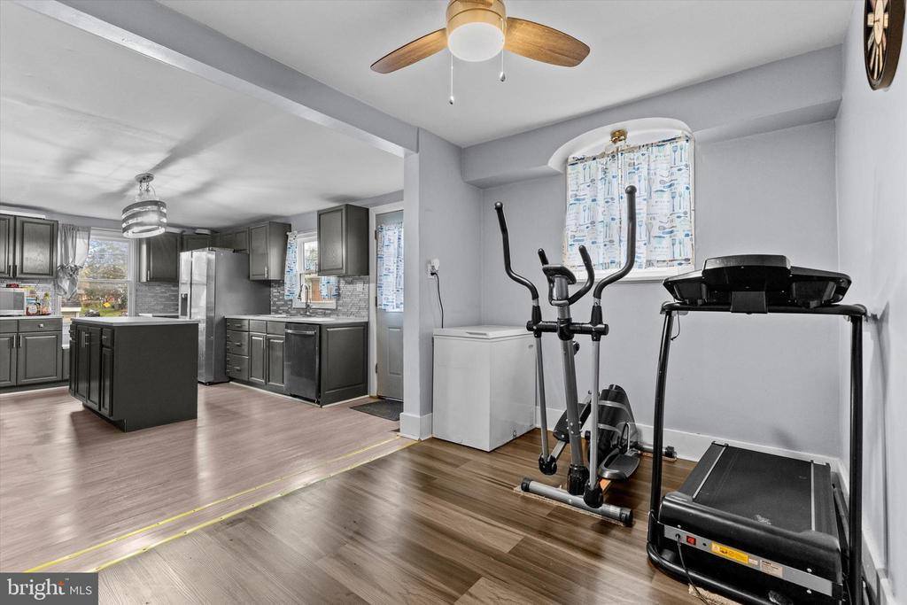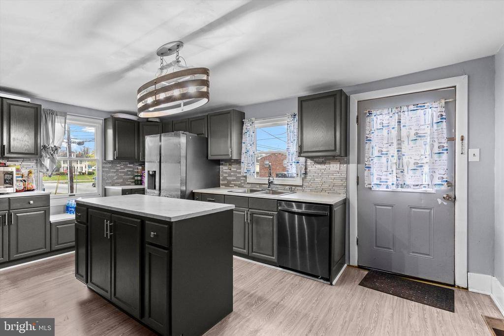 a newly remodeled kitchen with stainless steel appliances, luxury vinyl plank flooring, modern lighting, and fresh, neutral paint throughout, creating a welcoming and move-in-ready environment. Just steps away, the second-floor in-law quarters offer privacy