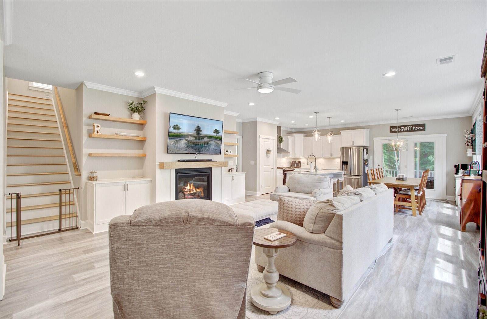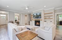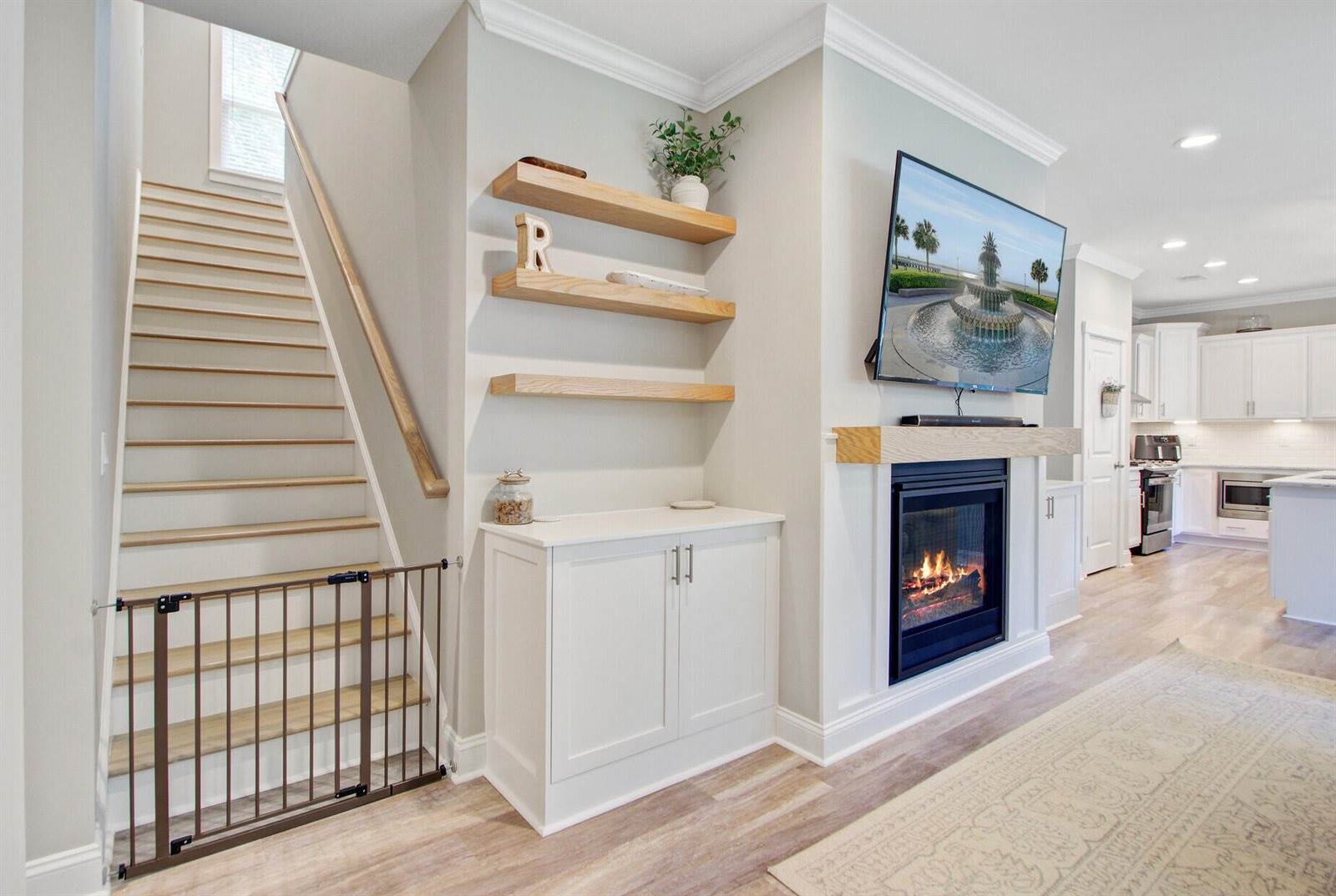 room & kitchen. Relax and unwind in the spacious family room. Gas fireplace with wood mantel is flanked by custom cabinets and floating shelves. 3 sunny windows offer wonderful light and boast custom window shades. Gourmet kitchen features Quartz countertops