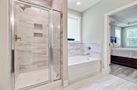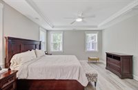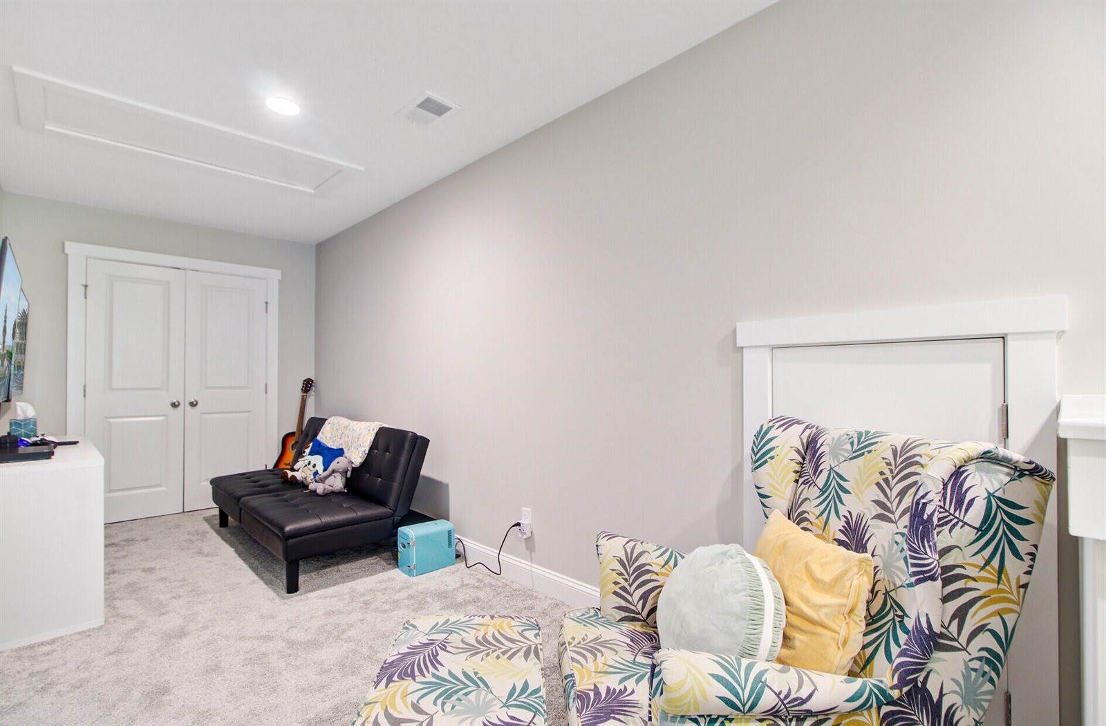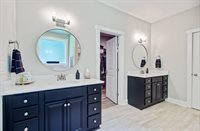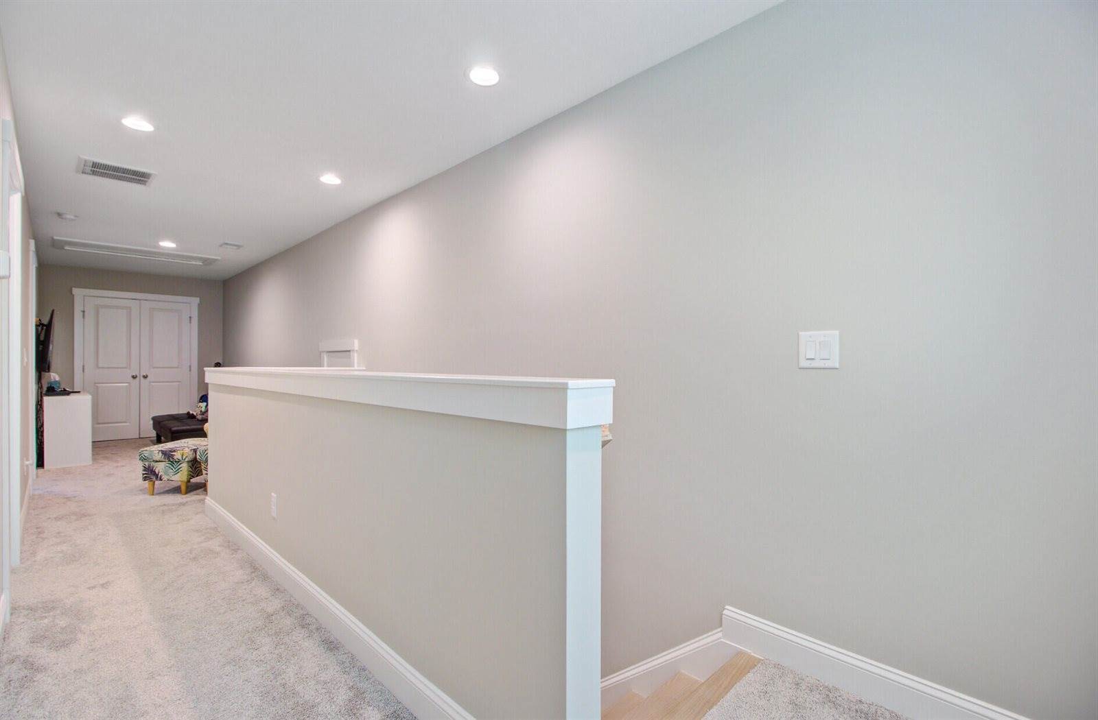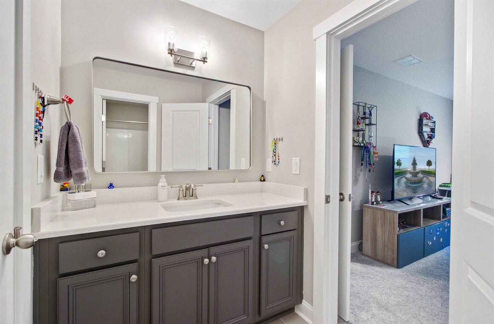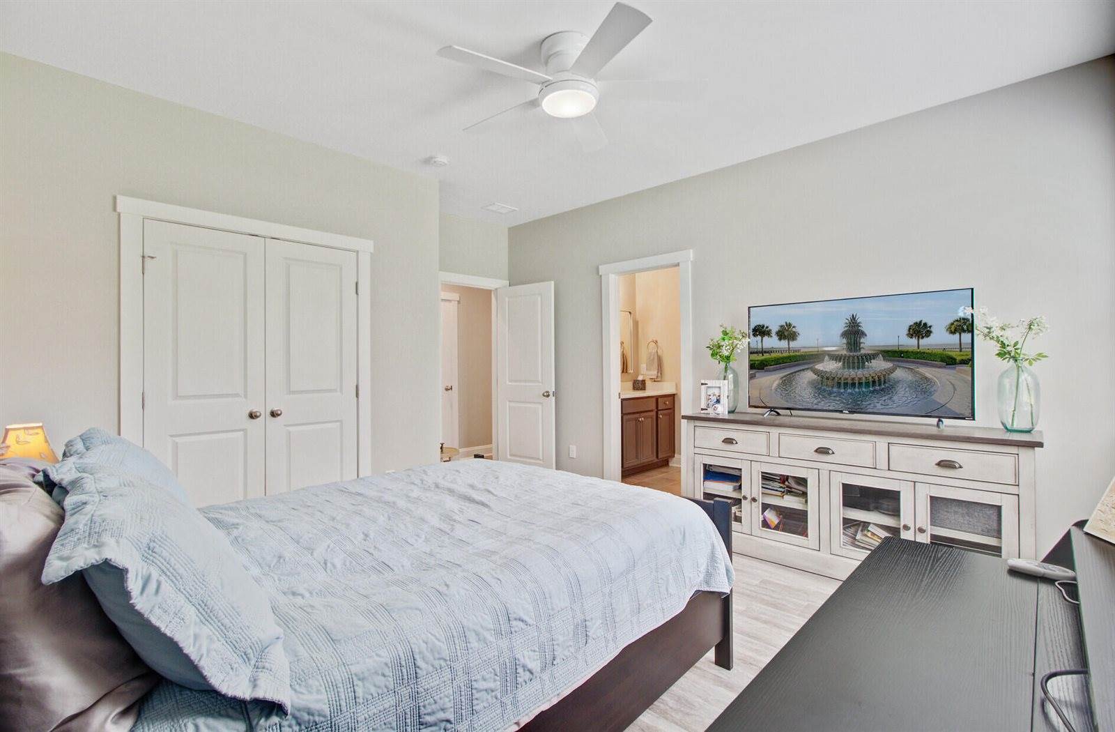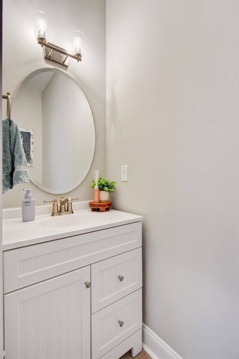 guest suite with private full bath on the main level offers great space for family and friends! Half bath in hallway is ideal for guests and features upgraded vanity and framed mirror. First floor hallway offers a coat closet, large double door storage closet