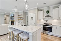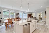with center island and bar seating. Subway tile backsplash is a great accent and the upgraded gas range and stainless steel appliance package complete with pot filler is sure to delight the family chef. The first floor owner's suite provides a quiet retreat
