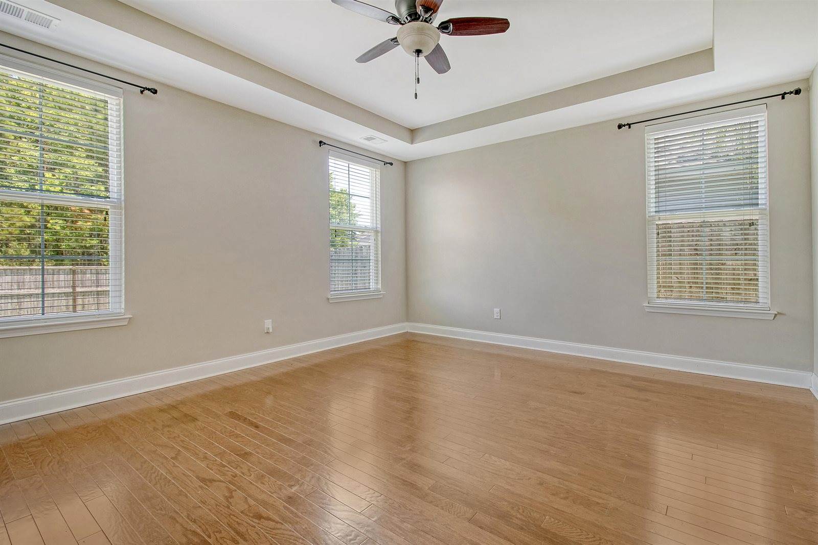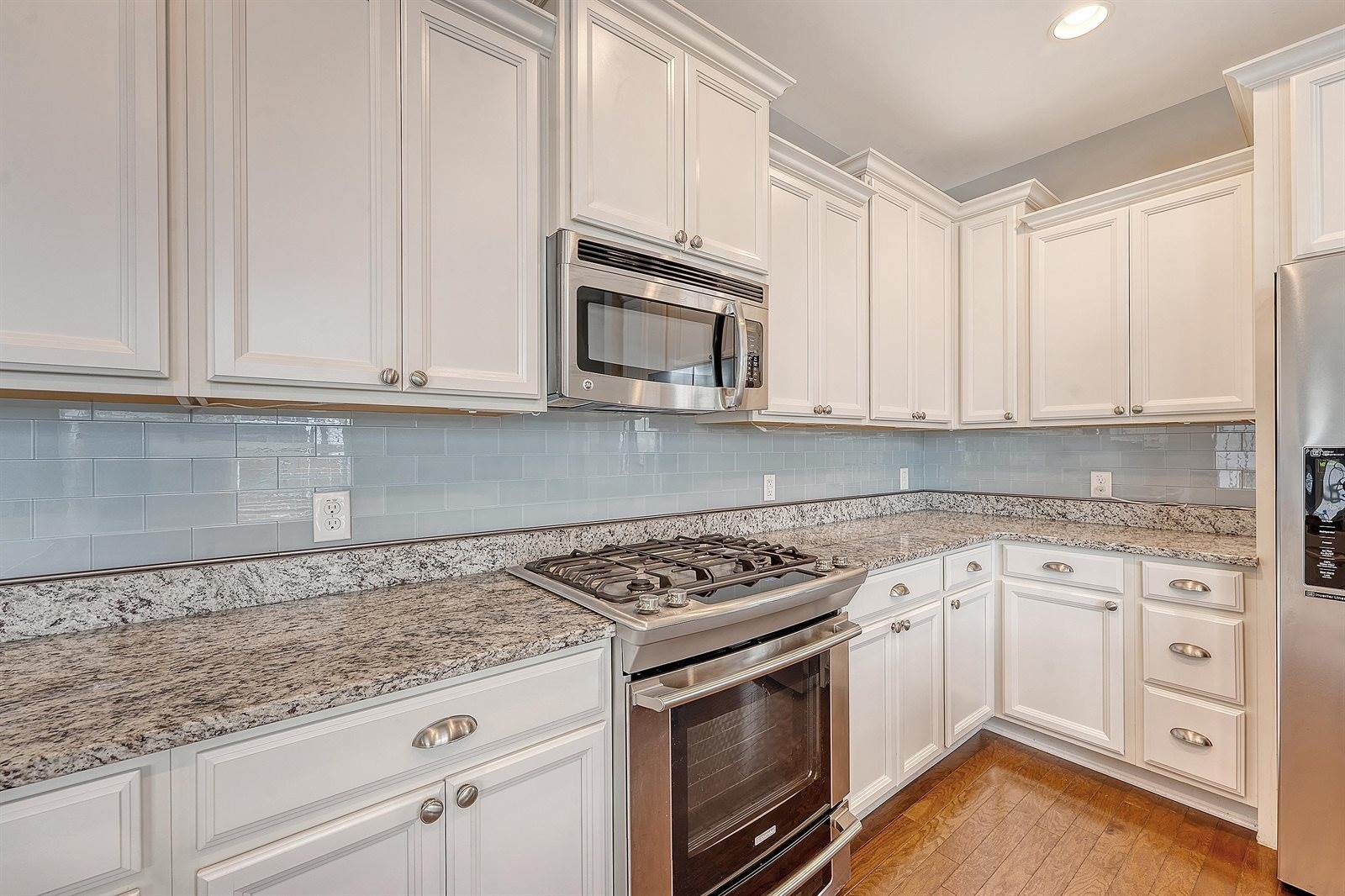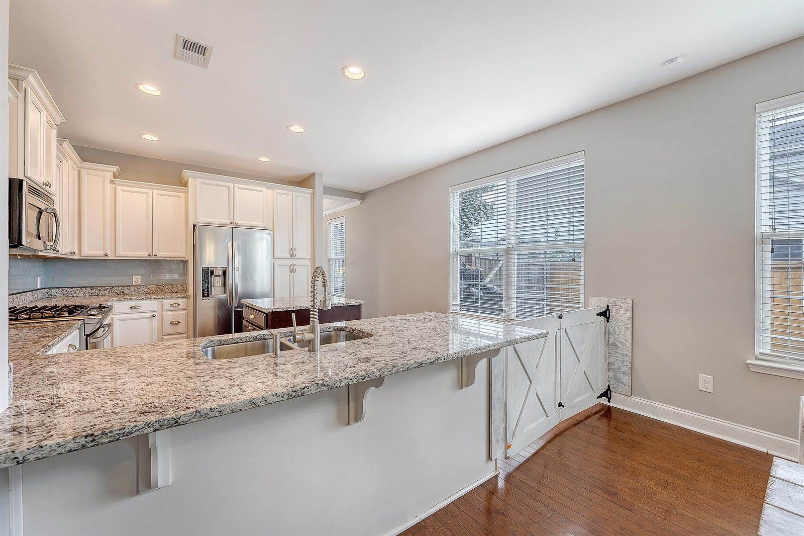 located half bath sits just off the entry. As you continue through the home, you'll notice gorgeous wood flooring and elegant tray ceilings. The kitchen has been thoughtfully updated with recessed lighting, granite countertops, stunning white cabinetry, and