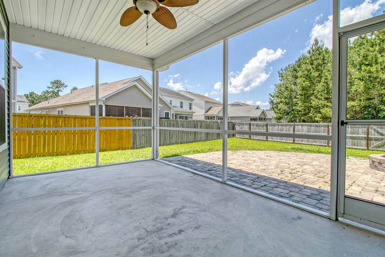 step out into the screened-in porch and enjoy the serene backyard. A lovely paver walkway leads to a seating area with a built-in fire pit ideal for entertaining. The fully fenced yard offers privacy and space, with no homes directly behind the property. Keep