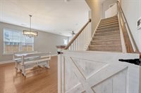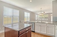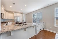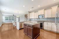 stainless steel appliances. A central island with rich dark cabinets provides additional prep space and adds contrast and style. The kitchen flows seamlessly into the dining area and spacious living room creating a true open-concept layout.Just beyond the