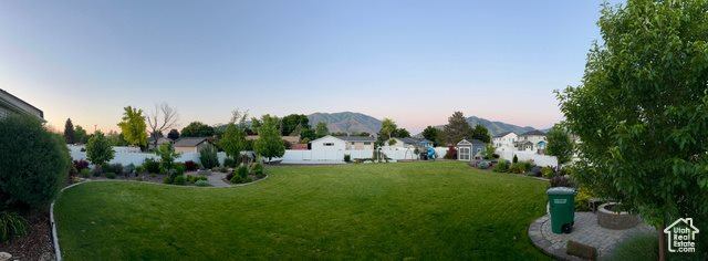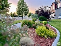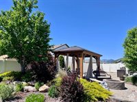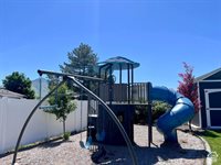 one wood-burning), a hot tub, and a full playset. The fully fenced yard offers breathtaking mountain views and feels like your own private park, with curved garden beds, mature trees, and expansive green space for entertaining, relaxing, or playing. Additional