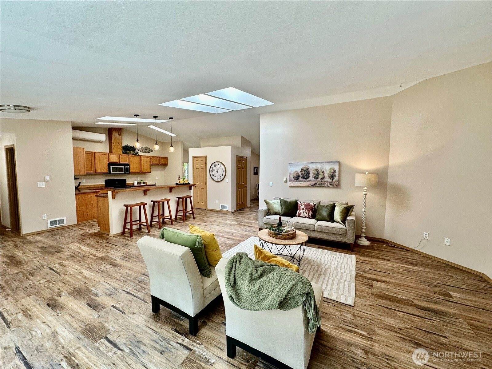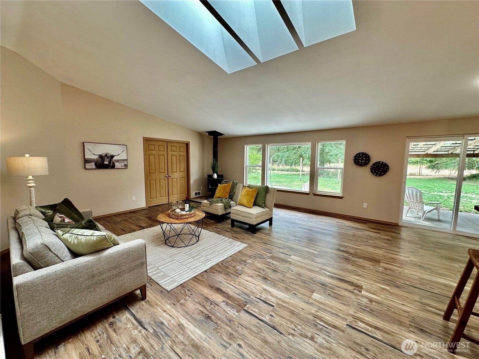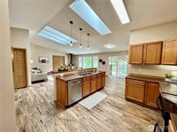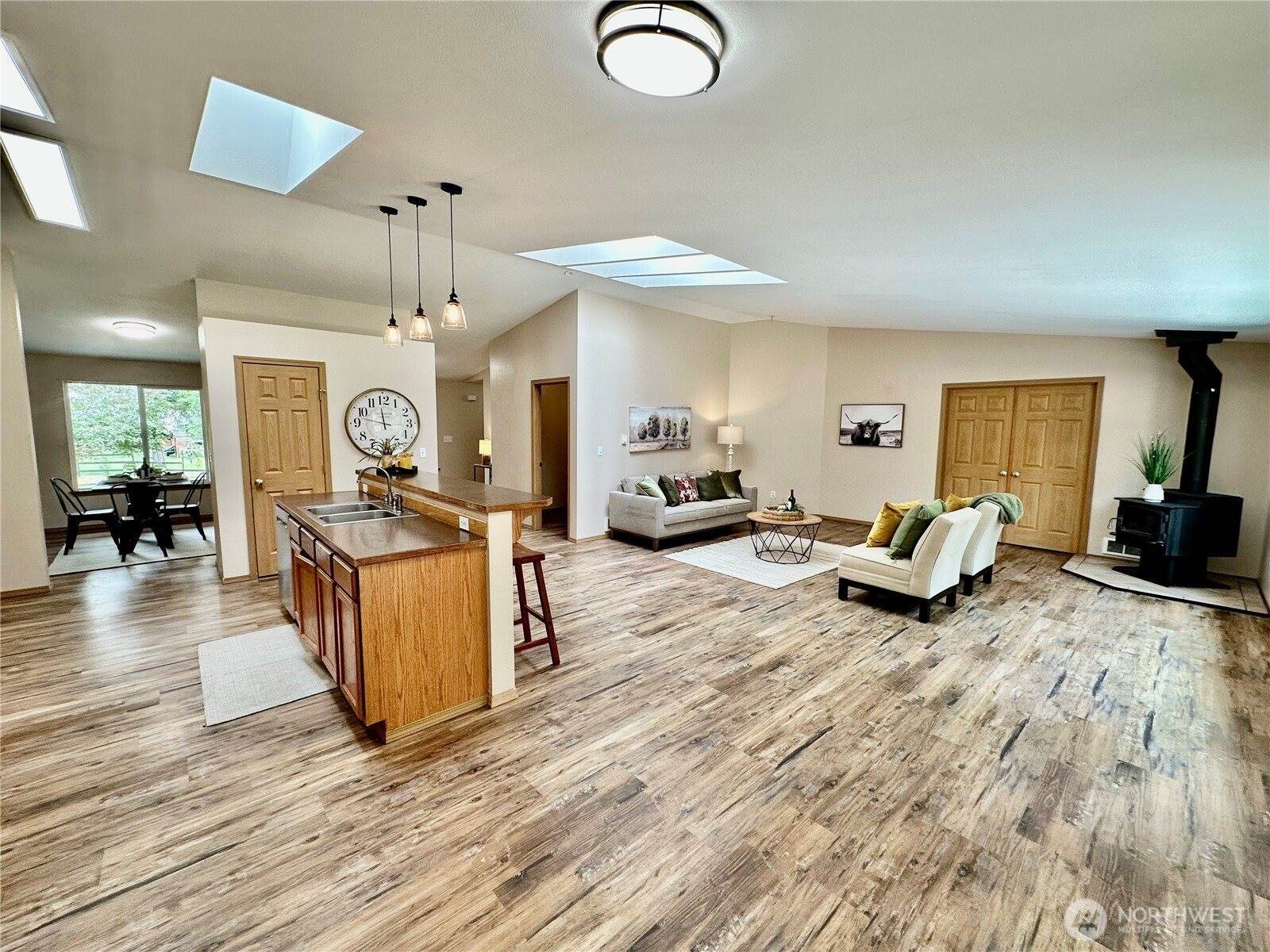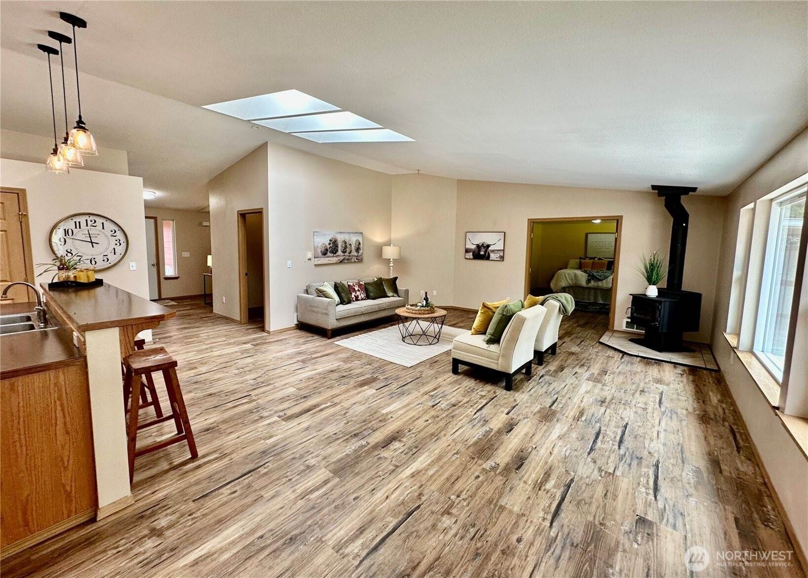 with vaulted ceilings, skylights & wood stove. Kitchen offers bar with seating, formal dining room as well. Large primary with 5-piece bath & walk-in closet. 3 big additional bedrooms & hall bath with dual vanities. Newer laminate flooring throughout home.