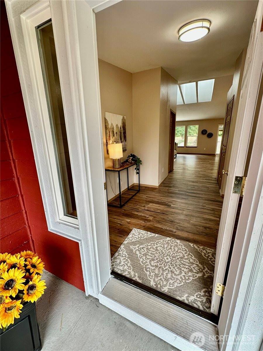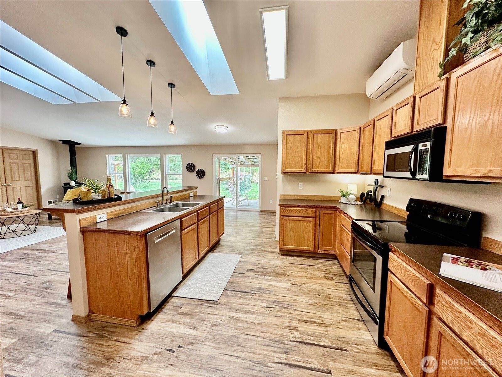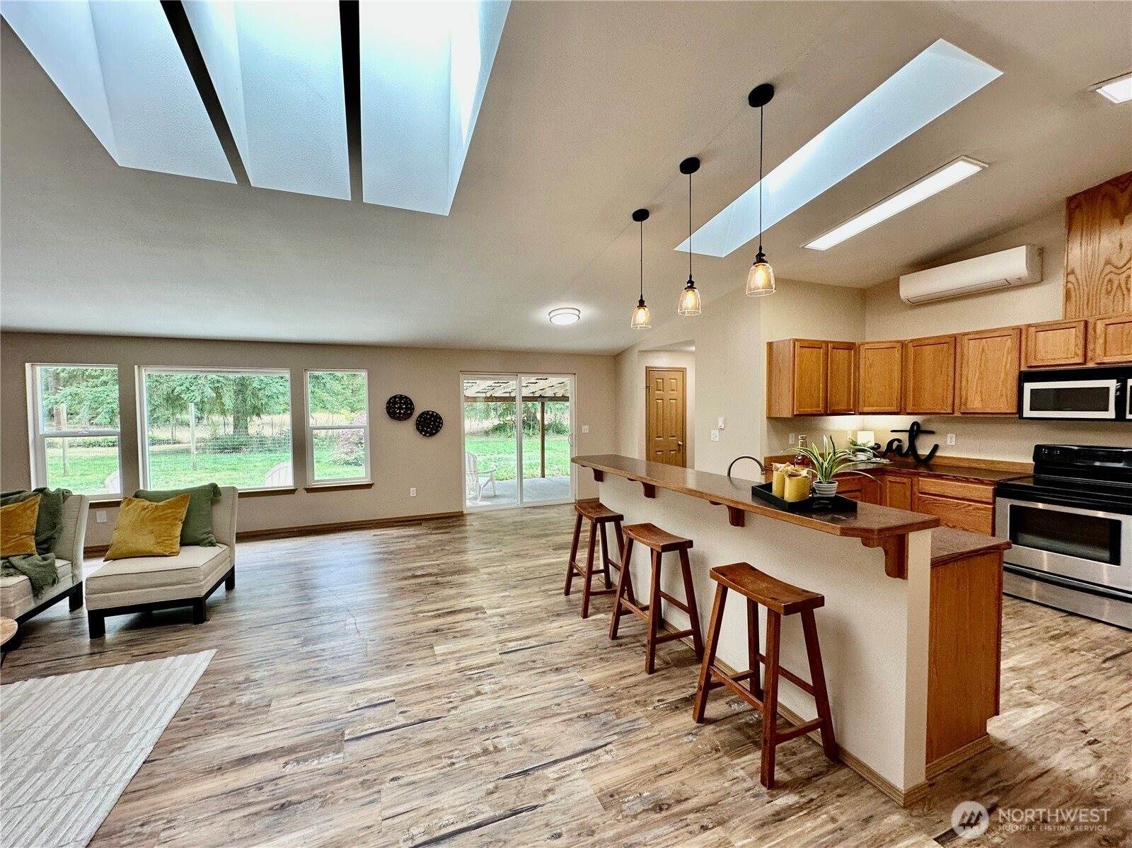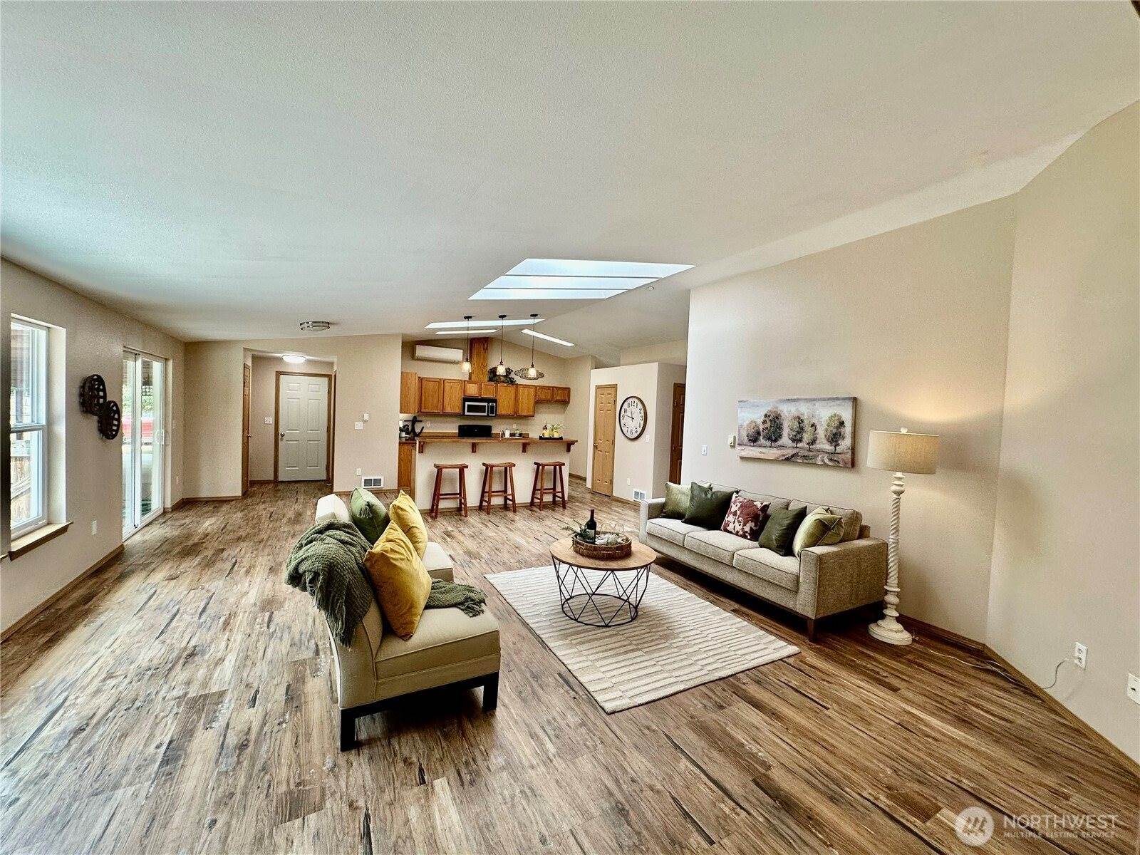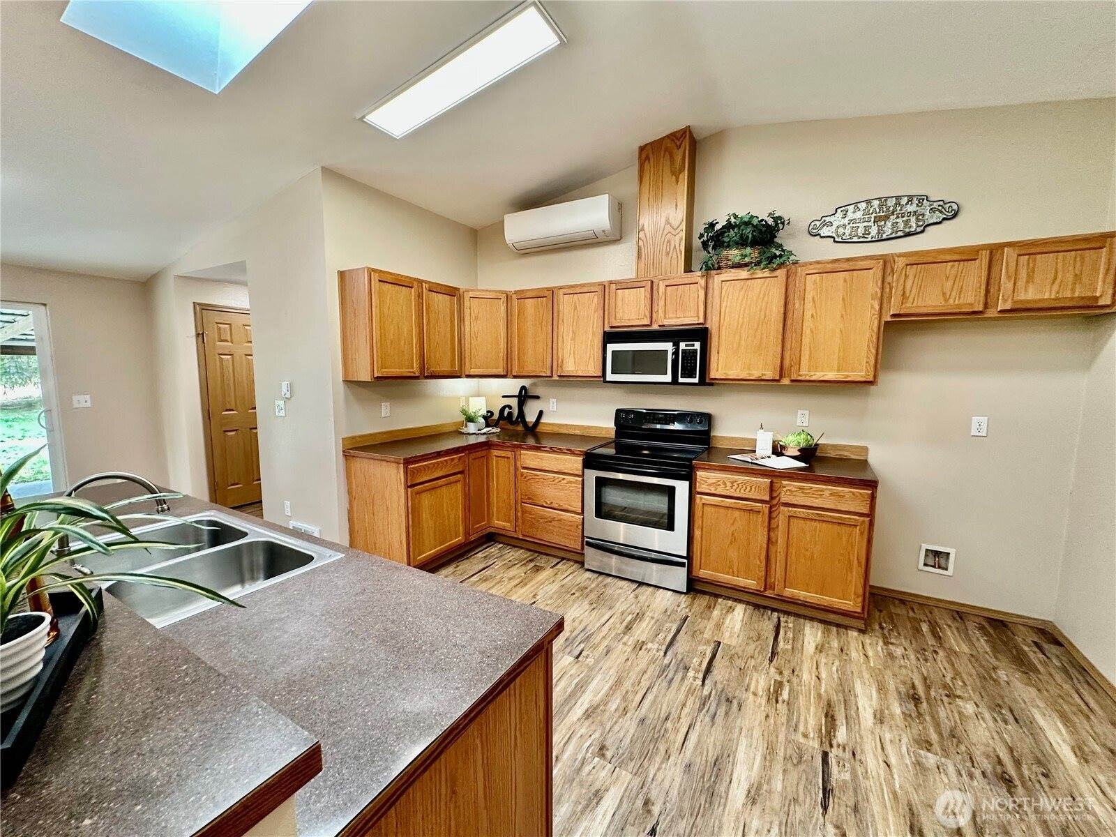 with vaulted ceilings, skylights & wood stove. Kitchen offers bar with seating, formal dining room as well. Large primary with 5-piece bath & walk-in closet. 3 big additional bedrooms & hall bath with dual vanities. Newer laminate flooring throughout home.